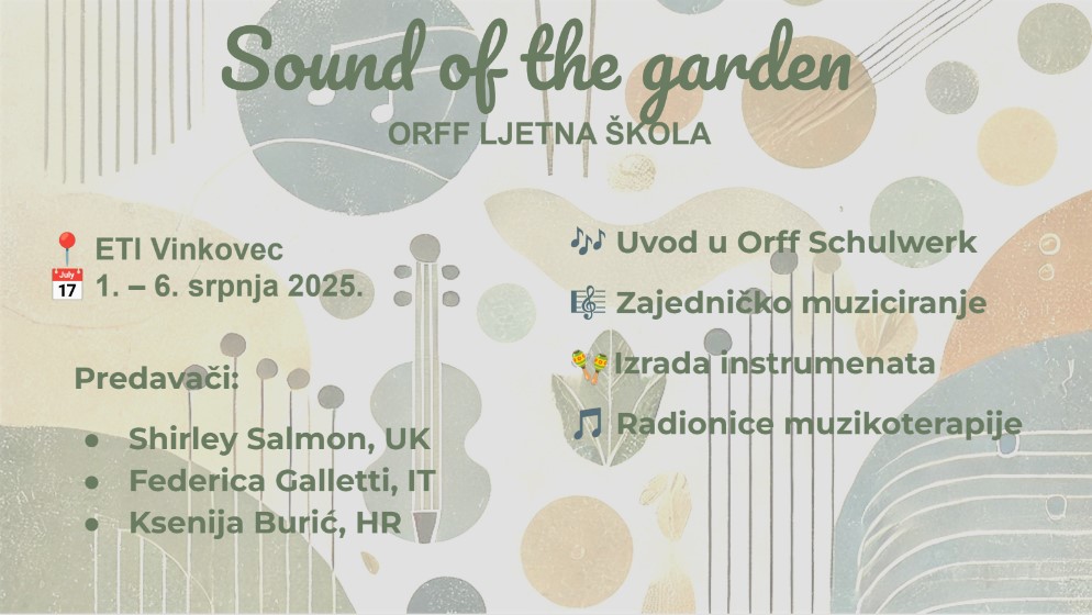 Šestodnevna Orff Schulwerk edukacija pod nazivom Sound of the Garden održat će se od 1. do 6. srpnja 2025. na Edukacijsko-terapijskom imanju Vinkovec, nedaleko Zagreba.